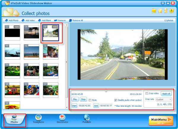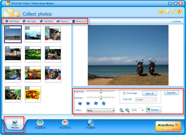 Import the photos and video clips, process photos with the built-in photo editing tool, which include some basic functions like Brightness, Contrast Crop, Rotate, Effect, etc. Also, video clips can be edit, set start and End time, crop video, disable audio when ouput,etc.