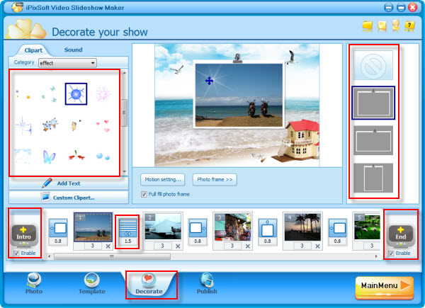 Click "Decorate"panel, set the "Intro and End" for the flash slideshow or disable them if you don't like it.Then click the effect box to select the suitable transition effects including switch and push effects to make the slideshow more vivid. Depend on yourself,you can choose each slide a effect and set the transition and photo duration or apply the same transition effect to all slides.What's more,you can add some suitable texts to each photo to make it more meaningful.