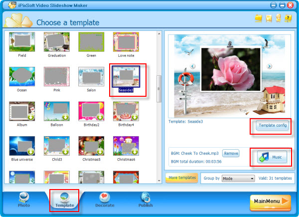 Video slideshow maker provides you lots of per-designed templates, select one you like. If you would like to enable control buttons, simply click "Template config" button to change setting. After this, click the "Music" button to add a MP3/WMA/WAV audio file, it is optional.